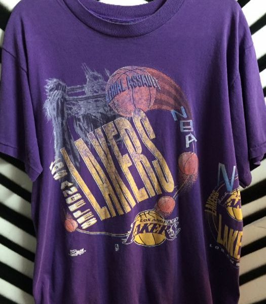 1992 Los Angeles Lakers t-shirt, screen printed from and back, purple shirt/multi-color design, size L