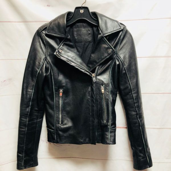 MOTORCYCLE JACKET, SIDE ZIP-UP, LAMB LEATHER, 2 SIDE POCKETS WITH ZIPPERS, BLACK, SIZE XS SMALL FIT (BLACK)