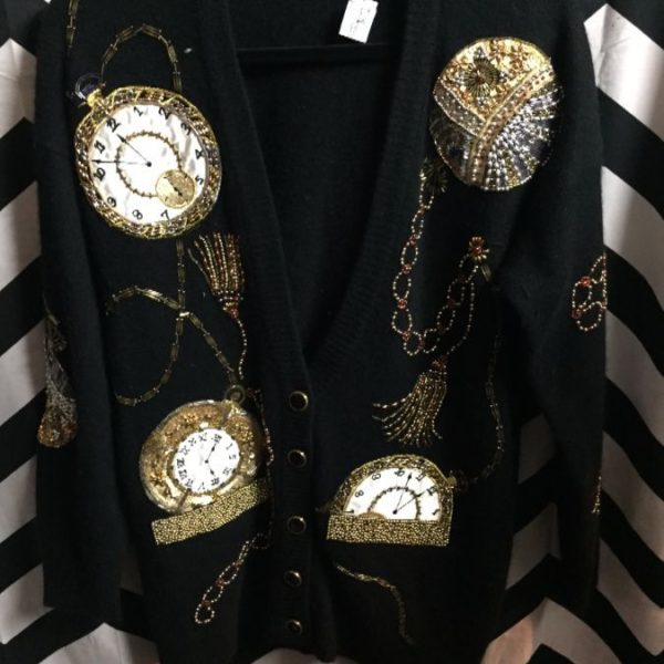 Cardigan sweater, lambs wool & Angora, button-up, sequins & bead embellished applique, black/gold/white, size L