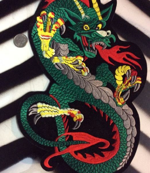 Fire breathing dragon with claws back patch, embroidered, green dragon/yellow claws/red fire & back scales, large
