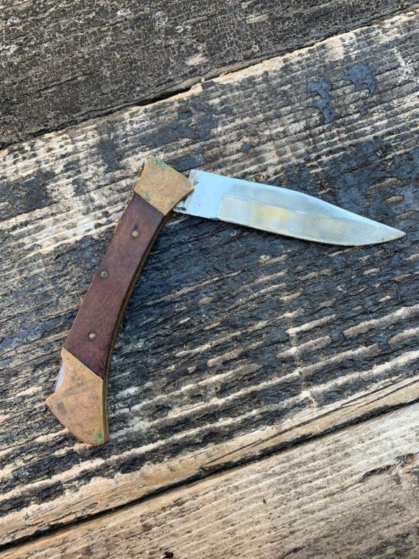 LARGE WOOD HANDLE POCKET KNIFE BRASS DETAIL
