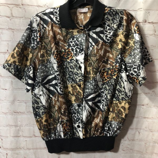 LAUREN LEE TOP, SHORT SLEEVES, BUTTON, SILKY, RIBBED COLLAR & BOTTOM, FUNKY ANIMAL PRINT DESIGN, WHITE/BROWN/TAN/GRAY/BLACK, SIZE M