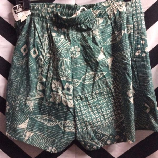 Woolrich swim shorts, elastic waist, leaf/flower/organic pattern print, deadstock, green/white, size M