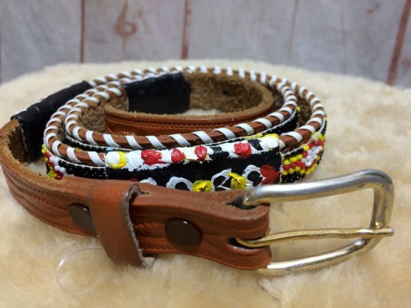 Belt, leather, whip stitched edges, painted sections, multi-color beaded designs, brown/red/black/yellow/white