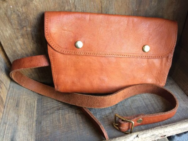 Luz fanny pack/pouch bag, handmade, leather, snap up pouch closure, logo on back, adjustable leather belt with buckle, brownish orange