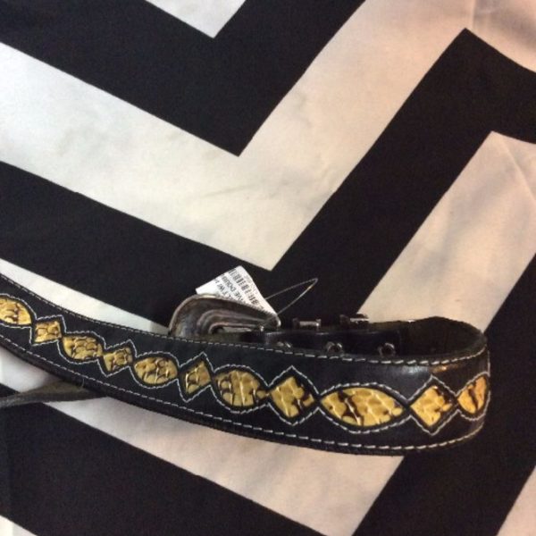 BELT – LEATHER – INLAYED SNAKE DECORATIVE DESIGN – SILVER BUCKLE/TIP & DOUBLE LOOPS