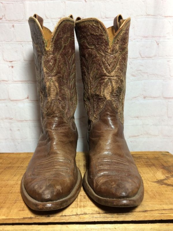 COWBOY BOOTS, LEATHER, 2 COLOR DECORATIVE STITCHING, FADED WITH COLOR WORN OFF OF LEATHER UPPERS, BROWN/GREEN/YELLOW AS IS