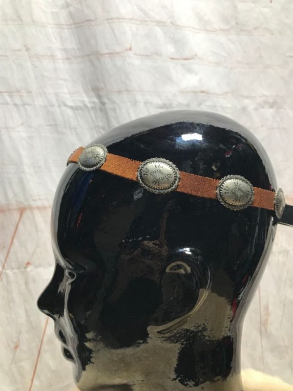 Hat band, leather, silver metal conchos with engraved Aztec design, can be used as a head band, brown/silver, size 21″