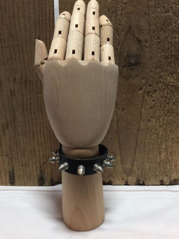 BRACELET, SNAP-ON, LEATHER & SILVER METAL SPIKES, BLACK/SILVER