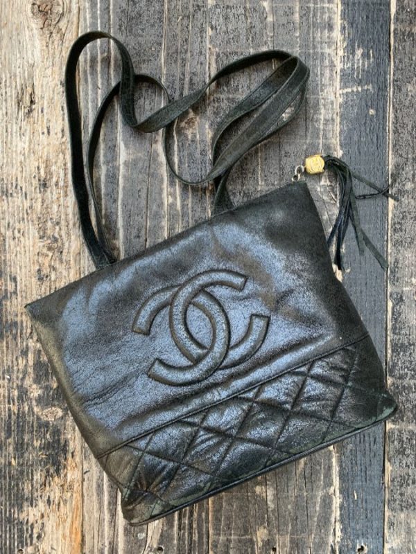 LEATHER TOTE BAG LARGE CC CHANEL QUILTED LOGO AS-IS *DISTRESSED