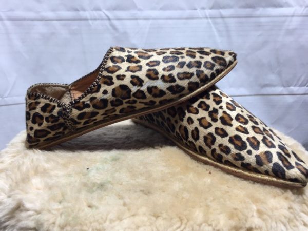 LEOPARD PATTERN PINY HAIR MOROCCAN SLIP ON BABOUCHE POINTY TOE SLIP ON SHOES – AS IS