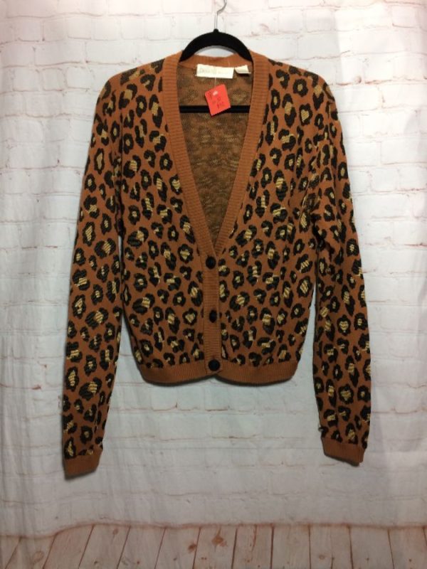 Dana Buchman sweater, knit, cardigan style, button-up, Leopard print, light-beige/brownish-orange/dark brown, size S