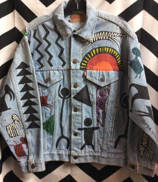 LEVIS DENIM JACKET – 1992 M STEWART CUSTOM DESIGN – NATIVE AMERICAN GRAPHIC W/BEADS