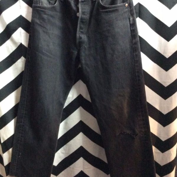 Levis denim jeans, 501, red tab, cut off cuffs, soft, black, size 33W x 30L missing Levis back pocket label
