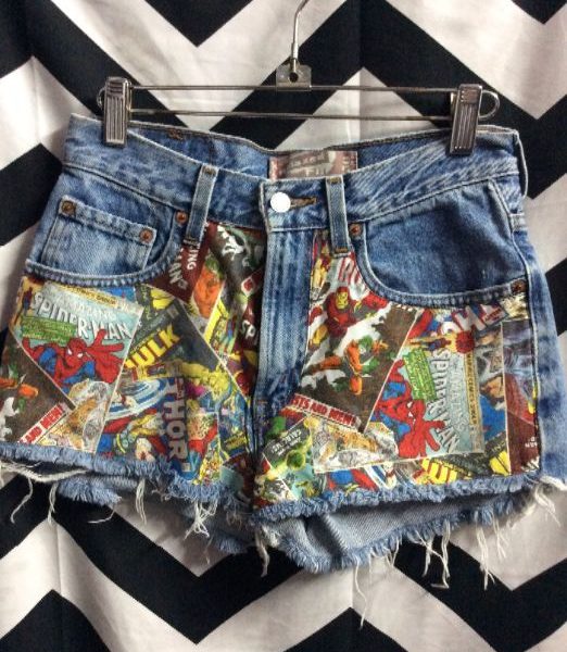 LEVIS DENIM SHORTS – CUTOFF – 501 – BUTTON FLY – COMIC BOOK PRINT FRONT POCKETS