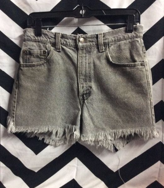 Levis denim shorts, cutoff, 501, red tab, zip-up, frayed, gray, size W27