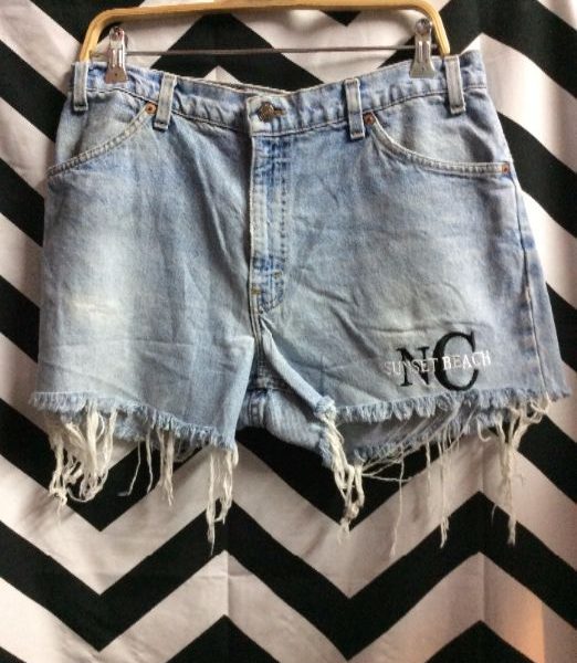 Levis denim shorts, cutoff, zip-up, 501, Sunset Beach NC embroidered on left leg, light blue, size W32