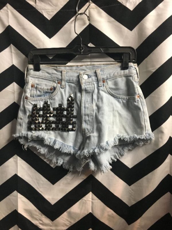 LEVIS 501 DENIM CUTOFF SHORTS W/ PUNK INSPIRED DESIGN