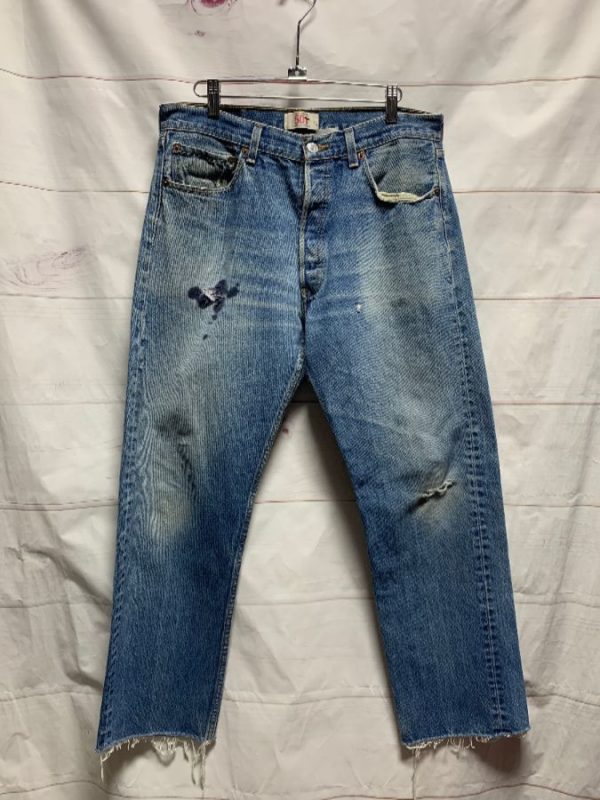 LEVIS DENIM JEANS, BUTTON FLY, 501, RED TAB, STRAIGHT LEG, FRAYED HEM, ACID WASHED, DISTRESSED & STAINED, BLUE, SIZE 34W X 32L AS IS