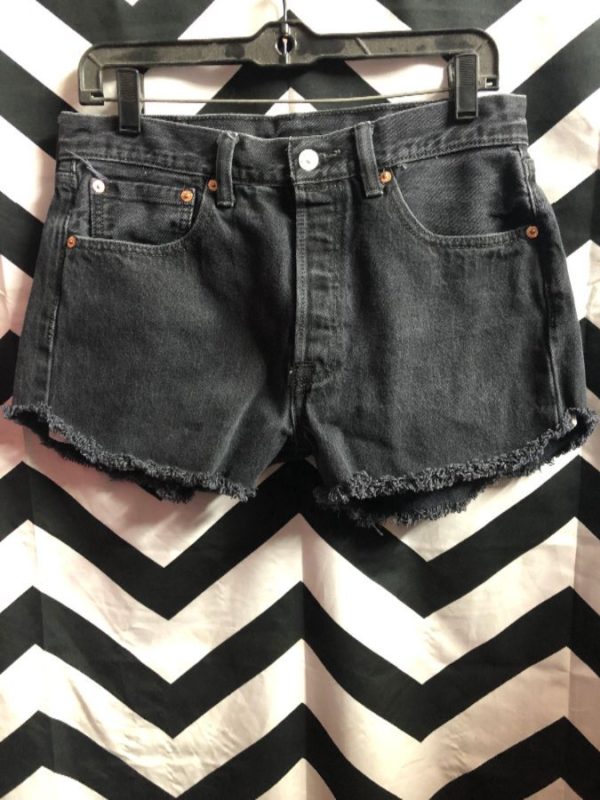 Levis denim shorts, 501, red tab, cut-off, acid washed, black, size 32″W as is