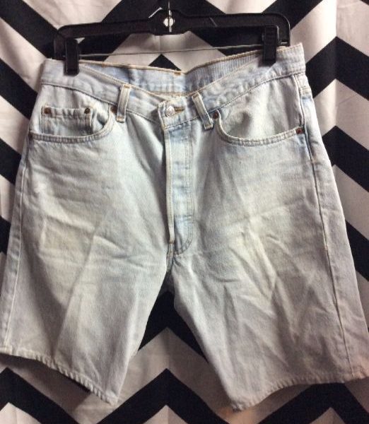 Levis denim shorts, hemmed, 501, red tab, bleach washed, pale blue, size 33W