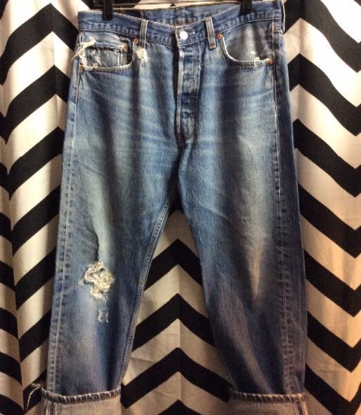 CLASSIC LEVIS DENIM JEANS – 501 – RED TAB – ACID WASHED – FRAYED POCKET & LEG
