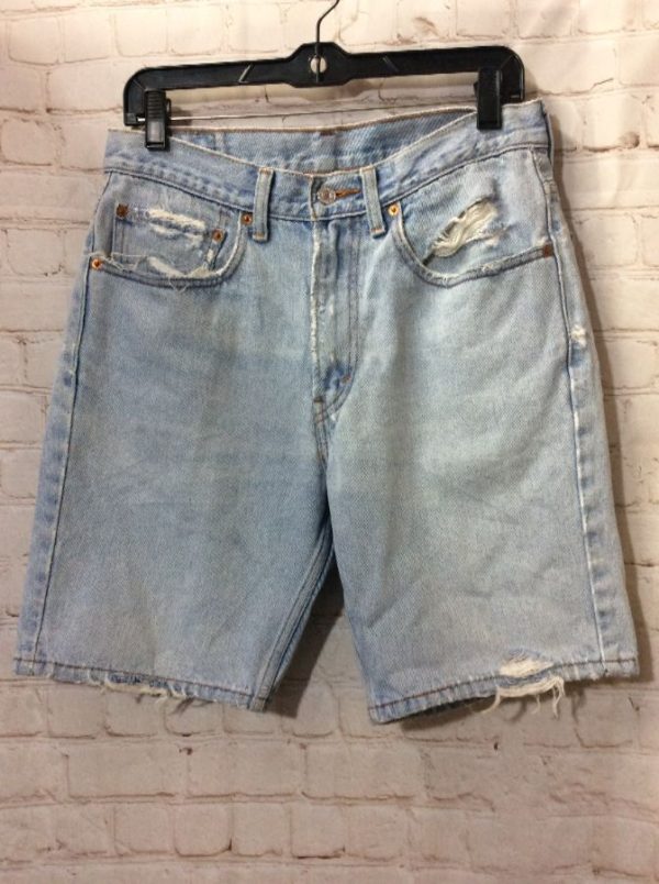 Classic Levis denim shorts, cut-off, red tag, long length, 505, acid washed, frayed pockets, pale blue, size 31W