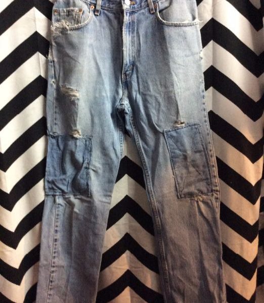 CLASSIC LEVIS DENIM JEANS – 505 – RED TAB – ACID WASHED – FRAYED – PATCH WORK