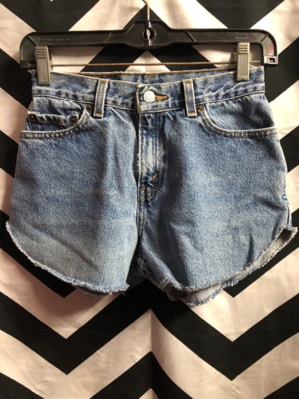 Levis denim shorts, 550, cut-off, magic cut, zip fly, acid washed, medium blue, size 25″W