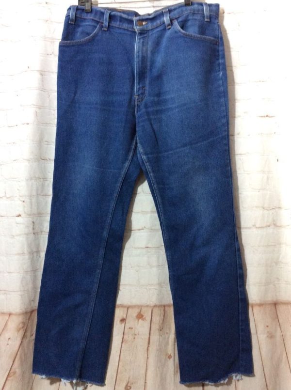 RETRO LEVIS DENIM ACTION JEANS, COTTON, FRAYED ANKLES, BLUE, SIZE 38W X 34L