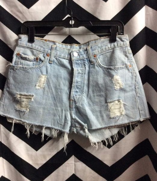 Vintage Levis denim shorts, cutoff, 501, red tab, frayed front, soft, acid washed, light blue, size W30
