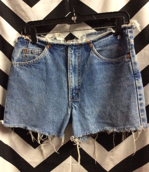 LEVIS DENIM SHORTS – CUTOFF – CUT AWAY WAISTE BAND – ORANGE TAB – DISTRESSED