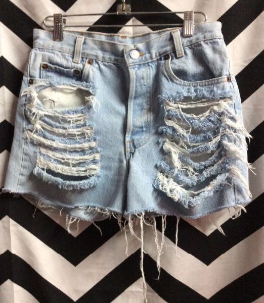 LEVIS DENIM SHORTS – CUTOFF – RED TAB – SHREDDED FRONT POCKETS – ACID WASHED