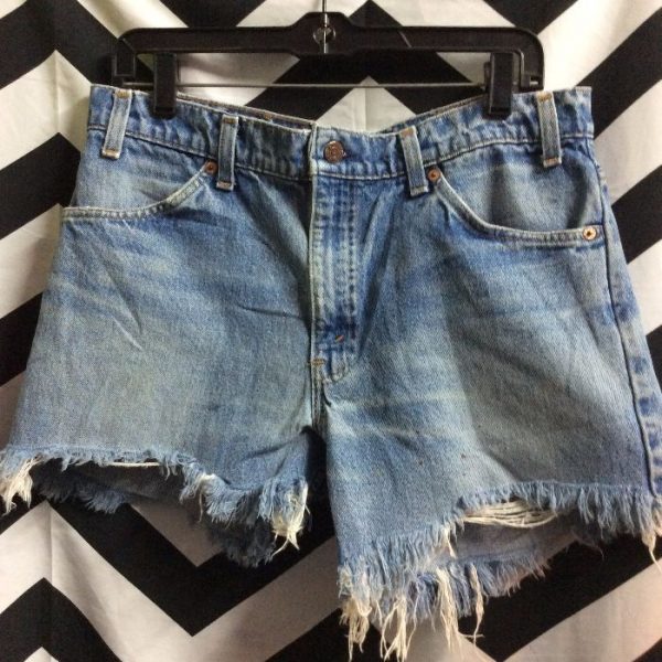LEVIS DENIM JEANS SHORTS – CUTOFF – SOFT – ORANGE TAB – FRAYED BOTTOM