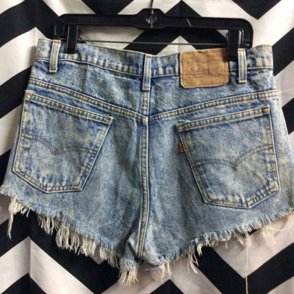 Levis denim jean shorts, cutoff, orange tab, rips and frays, acid wash, acid blue