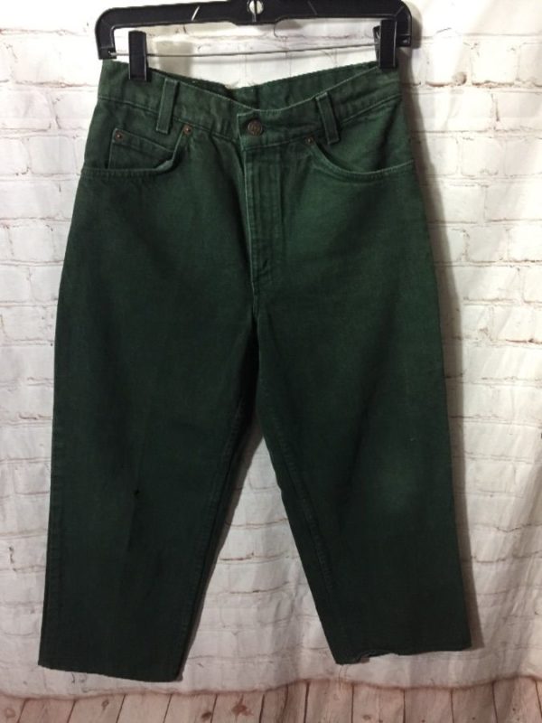 Levis denim jeans, cropped, 550, zip-up, orange tab, front & back pockets, dark green, size 29W x 30L