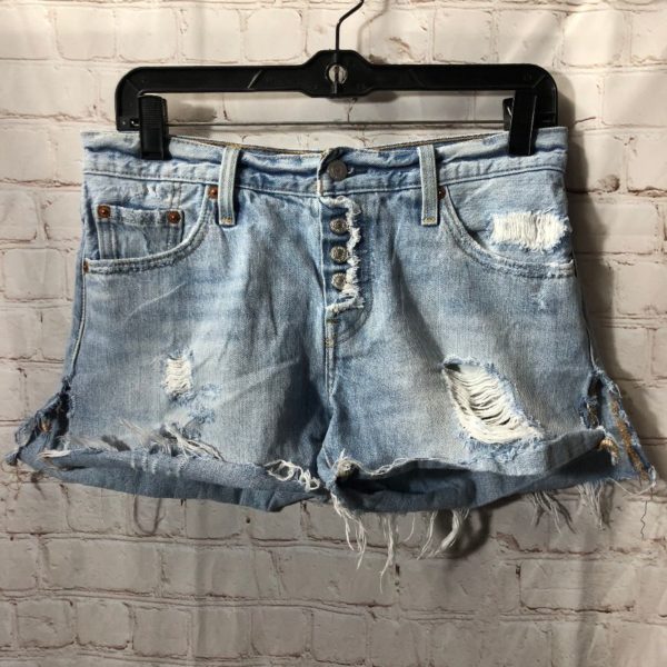 Levis denim shorts, cut-off, button fly, frayed & tattered, acid washed, light blue, size 25W