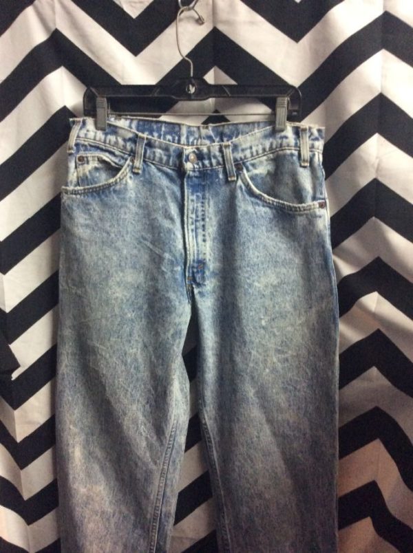 Levis denim jeans, zip-up, high rise waist, distressed, acid washed, light blue, size 36″W