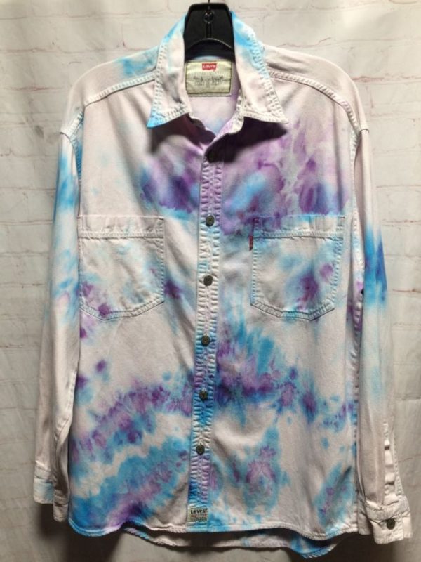Levis denim shirt, red tag, tie-dyed, long sleeves, button-up, front pockets, blue/purple/white, size L As is
