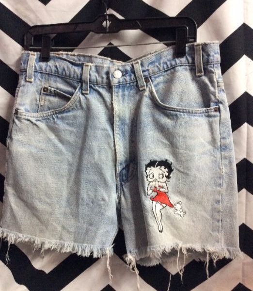 Levis denim shorts, cutoff, orange tab, custom embroidered Betty Boop, pale blue/red/black/white, size 32W