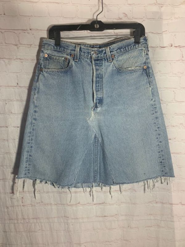 Levis denim skirt, reconstructed jeans, cut-off, zip-up, mid length, front & back pockets, light acid wash, size 32W