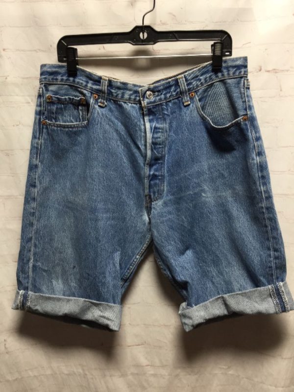 Levis denim shorts, cut-off with cuffs, long length, 501, zip-up, red tab, medium blue, size 38W