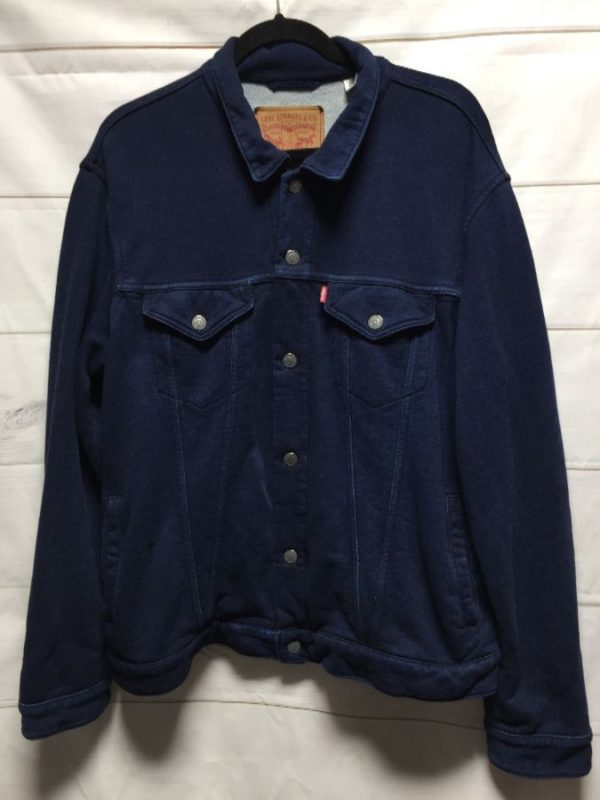 Levis trucker jacket, long sleeves, button-up, red tag, thick fabric, dark blue, size XXL