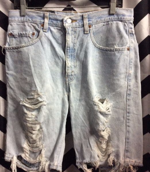 VINTAGE LEVIS DENIM SHORTS – CUTOFF – SUPER FRAYED – 505 – RED TAB – LONG LENGTH