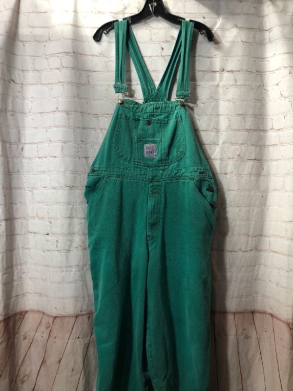 CLASSIC DARK DENIM OVERALLS GREEN TRIM ZIP FRONT POCKET