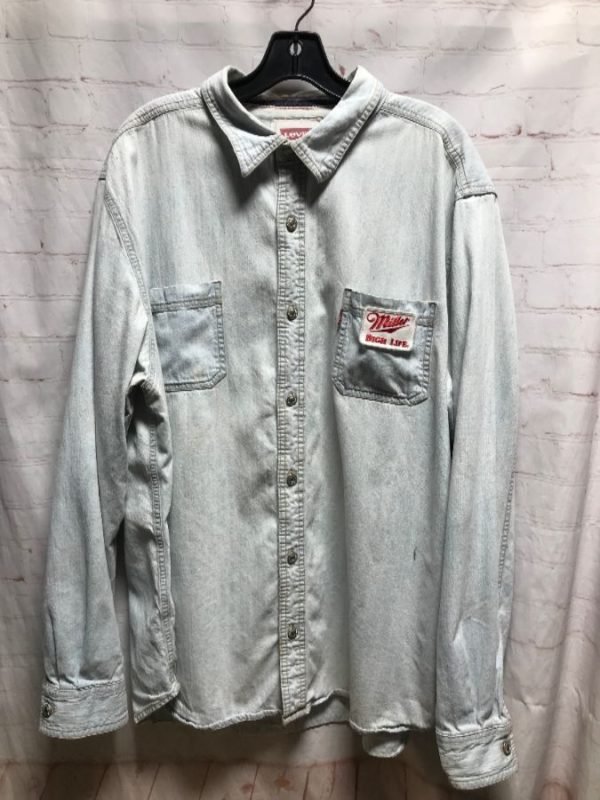 Levis denim shirt, long sleeves, button-up, Miller High Life embroidered patch on left chest pocket, light acid wash, light blue, size XXL As is
