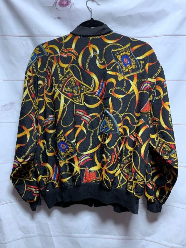 Peter Popovich bomber jacket, silky, zip-up, light weight, ribbed knit collar/cuffs/hem, Baroque print with ribbon streamers & chains, black/gold, size L