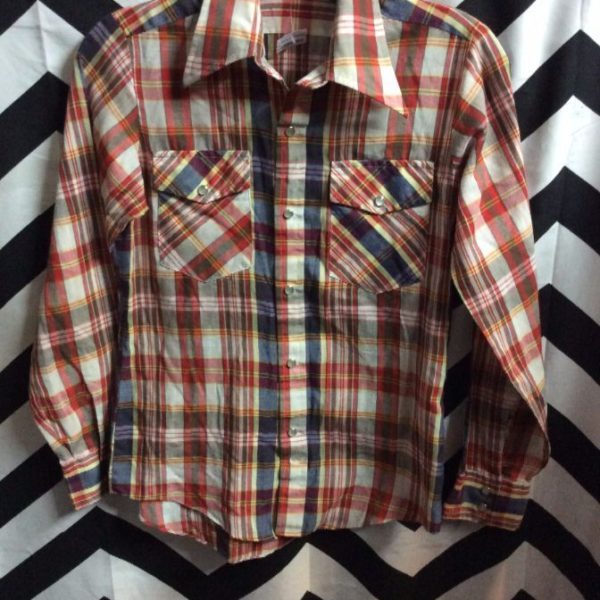 FLANNEL SHIRT, LONG SLEEVES, BUTTON-UP WITH PEARL SNAPS, FRONT POCKETS, LIGHT WEIGHT FABRIC WITH PLAID DESIGN, WHITE/RED/BLUE