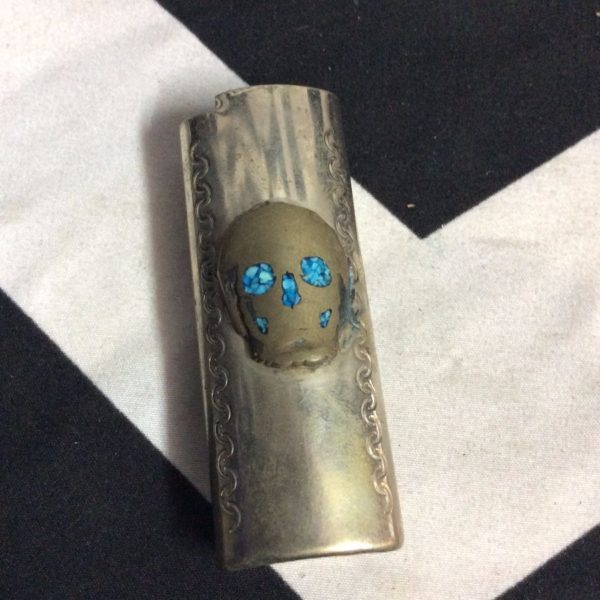 LIGHTER CASE W/SKULL DESIGN TURQUOISE INLAY W/SWIRL ENGRAVINGS