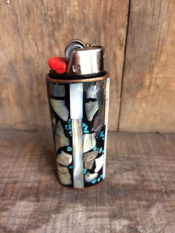 Lighter case, abalone chunks & turquoise chips, sterling silver & copper end trim, turquoise/white/copper/silver/black